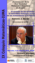 El miércoles 4 de mayo se presentó en Zaragoza la Real Sociedad Matemática Española y su Delegación Territorial en Aragón. En este acto participaron David Martín, vicepresidente de la RSME (ICMAT, Madrid), María Antonia Navascués, secretaria de la RSME, y Pedro J. Miana, Delegado Territorial RSME (IUMA, Zaragoza). A continuación se desarrolló el IX Coloquio del Instituto Universitario de Matemáticas de la Universidad de Zaragoza. La conferencia fue impartida por Antonio J. Durán, catedrático de Análisis Matemático de la Universidad de Sevilla, y llevó por título: El corazón de las tinieblas: la naturaleza humana a la luz de las matemáticas (y la física).El miércoles 4 de mayo, la cadena de televisión autonómica Aragón Televisión realizó una breve entrevista al vicepresidente de la RSME, David Martín, y a Antonio J. Durán, catedrático de la Universidad de Sevilla, con motivo de la Presentación de la RSME en Aragón y el IX Coloquio Matemáticas-IUMA. La emisión se realizó en el […]