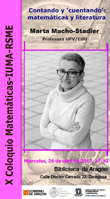 Como colofón a las actividades que se han venido desarrollando desde el pasado mes de noviembre en el marco de la “Exposición RSME-IMAGINARY: Matemáticas y Arte” en Almería, se hizo entrega de los premios del Concurso SURFER-CAIXABANK dirigido a estudiantes de secundaria y bachillerato de la provincia de Almería.La presencia de las matemáticas en la literatura y de la Literatura en las matemáticas es más notable de lo que en un principio podría sospecharse. Aprovechando la cercanía del Día Internacional del Libro, domingo 23 de abril, el X Coloquio Matemáticas IUMA-RSME se centrará en esta íntima conexión y se llevará a cabo el próximo 26 de abril. Para celebrarlo se ha invitado como ponente a la profesora Marta Macho Stadler, reconocida investigadora y divulgadora matemática de la Universidad del País Vasco. En esta ocasión se han organizado dos sesiones: a las 12:30, en el IES Miguel Servet, y a las 17:30 en la Biblioteca de Aragón (entrada libre).
