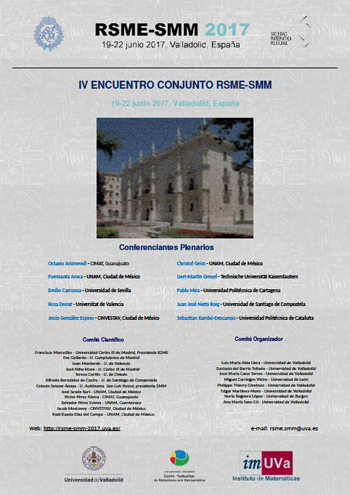 El IV encuentro conjunto entre la RSME y la Sociedad Matemática Mexicana se celebrará entre el 19 y 22 de junio en el Palacio de Congresos Conde Ansúrez (Valladolid). El programa consiste en veinticinco sesiones especiales y diez conferencias plenarias a cargo de Octavio Arizmendi, Fuensanta Aroca, Emilio Carrizosa, Rosa Donat, Jesús González Espino, Christof Geiss, Gert-Martin Greuel, Pablo Mira, Juan José Nieto Roig y Sebastià Xambó-Descamps.