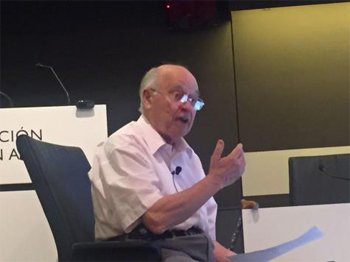 Alrededor de 300 personas asistieron a la conferencia que sir Michael Atiyah impartió en la Fundación Ramón Areces bajo el título “El Futuro de las Matemáticas”, una cita en la que el prestigioso matemático británico estuvo acompañado por el presidente de la RSME, Francisco Marcellán; el consejero científico de la Fundación, Amable Liñán, y el investigador del ICMAT Óscar García Prada, que moderó el encuentro.