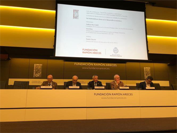 La Real Sociedad Matemática Española (RSME) abre el 1 de marzo de 2018 el plazo para la presentación de candidaturas para la concesión de las Medallas de la RSME en esta edición. El premio consiste en un diploma acreditativo y una medalla honorífica. Las Medallas de la RSME son distinciones que expresan público reconocimiento de la comunidad matemática española a personas destacadas por sus relevantes y continuas aportaciones en los ámbitos del quehacer matemático, considerándose como tales la educación, la investigación, la transferencia y la divulgación, entre otros, a lo largo de un amplio período de tiempo. Su concesión se regirá por las bases publicadas en la presente convocatoria. En esta edición se otorgará hasta un máximo de tres premios; su concesión se resolverá antes del 30 de junio de 2018. Las candidaturas únicamente podrán ser presentadas por socios individuales de la RSME y ninguna de las personas propuestas conocerá que es candidata al premio. La candidatura podrá ser mantenida en las dos siguientes convocatorias, siempre que la persona propuesta cumpla las condiciones recogidas en las bases.La RSME y la Fundación Ramón Areces han celebrado la conferencia “Las matemáticas claves en el desarrollo económico”, dentro del ciclo de jornadas organizadas para poner de manifiesto el papel creciente de las matemáticas en el desarrollo económico y las nuevas salidas profesionales. Andreu Mas-Colell, catedrático de Economía en la Universitat Pompeu Fabra en excedencia, y David Ríos, director de la Cátedra AXA-ICMAT de Análisis de Riesgos Adversarios en el Instituto de Ciencias Matemáticas del CSIC, han sido los ponentes de esta conferencia que estuvo moderada por el catedrático de la Universidad de Sevilla y director del IMUS, Tomás Chacón.