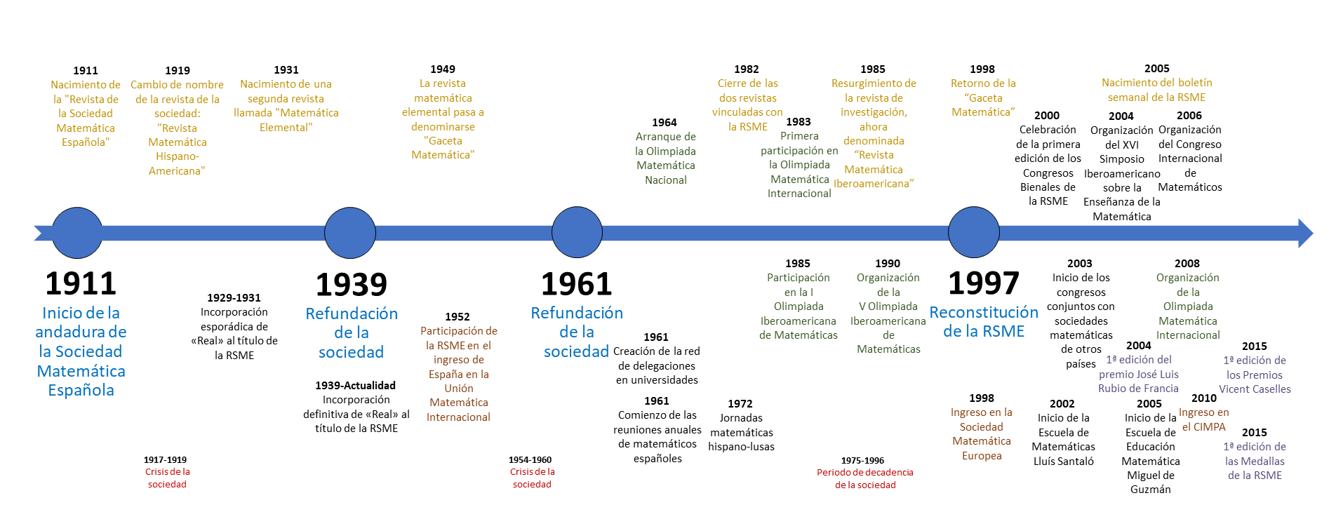 La RSME inició su andadura en 1911, dedicada a promover las matemáticas, su investigación, enseñanza, aplicaciones y difusión en un marco de relaciones internacionales. Entre sus actividades, destacó desde el principio la Revista de la Sociedad Matemática Española, que era el vínculo informativo, formativo y de cohesión entre los socios, además de motivo de intercambio con sociedades análogas de otros países. En 1917 se produjo una crisis interna que llevó al cierre de la revista y la paralización de la Sociedad. Resurgió en 1919 con la revista reorientada hacia la investigación y con nuevo nombre, Revista Matemática Hispano-Americana, iniciando una etapa próspera, en el contexto de la Edad de Plata de la cultura española, que duró hasta 1936. En su fundación, la Sociedad no se llamaba «Real», solicitó dicho título en 1928, lo incorporó a su nombre un año después y fue retirado al llegar la II República en 1931. Ese año apareció una segunda revista, Matemática Elemental, que equilibraba las tendencias investigadora y educativa presentes en el seno social. La SME solo pudo sobrevivir durante la guerra civil de 1936-39.